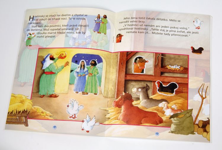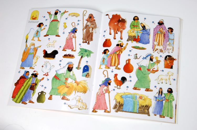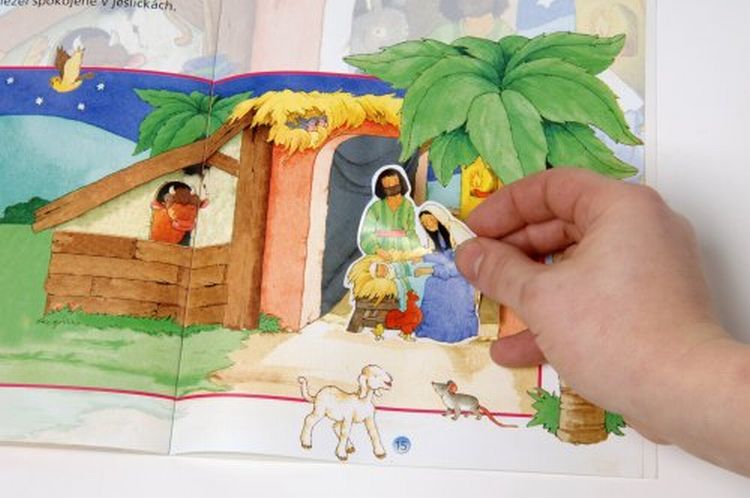 Každá dvoustrana představuje jednu scénu vánočního příběhu. Děti si mohou vybrat samolepky, kterými doplní příslušný obrázek. Tak se zábavným způsobem seznamují s příběhem Ježíšova narození a mohou hlouběji poznávat smysl vánočních svátků.