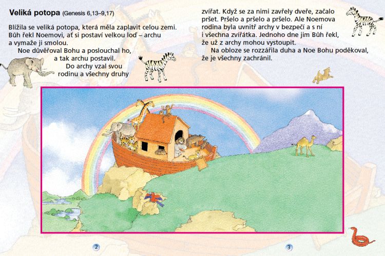 Tento sešit přináší dětem příběhy o Noemovi a jeho arše, o Debořině vítězství nad nepřáteli, o Eliášovi, kterého krmili havrani, o Jonášovi a velrybě, o Ježíšově narození, o marnotratném synovi a o tom, jak Ježíš nasytil pět tisíc lidí. Každá dvoustrana obsahuje jeden příběh a obrázek k tomuto příběhu. Na obrázku chybí důležité prvky, které jsou jako samolepky na prostřední dvoustraně. Děti si vybírají samolepky a doplňují jimi obrázek. Tak se děti zábavným způsobem seznámí se sedmi biblickými příběhy.