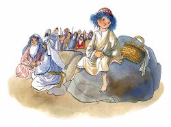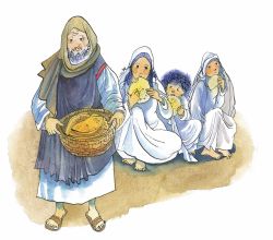 „Míko!“ zaznělo chlapci za zády. To maminka Ketla přinesla synkovi tuniku, tu novou, sváteční, a oblékla mu ji. Protože tu mokrou a roztrhanou nechal chlapec ostatním, aby jim připomínala tento zázrak rozmnožení chlebů. Byl tady i tatínek Areman. I on patřil mezi ostatní, co naslouchali Ježíšovým slovům.
